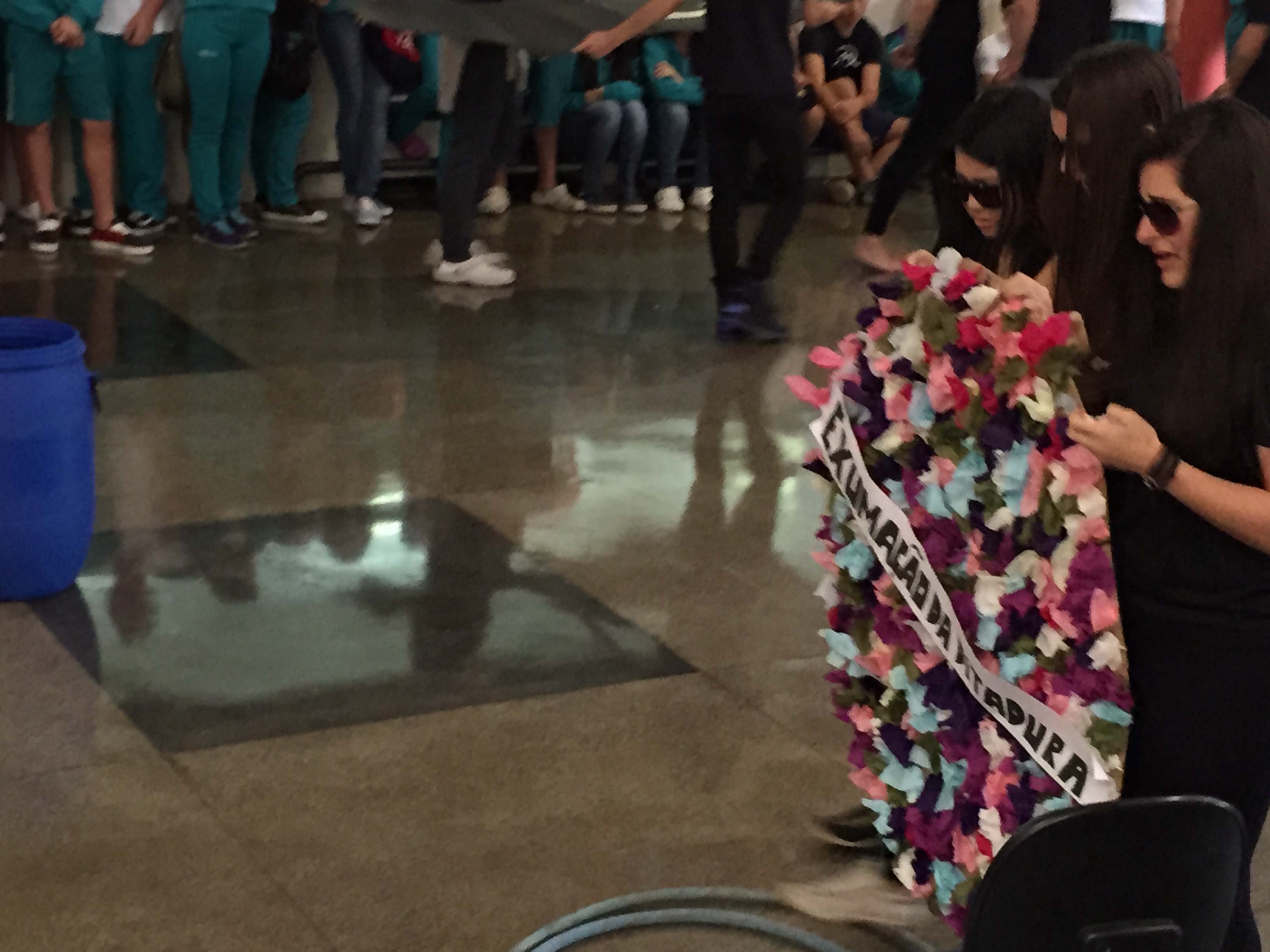 Depois, todos os alunos, professores e artistas convidados se reuniram no pátio central da escola para assistir à uma interferência (um tipo de “happening” como aqueles que eram feitos nos anos 60 e 70) de um grupo do Ensino Médio. Foi uma apresentação muito forte, sobre a ditadura Brasileira, com foco na violência e tortura promovidas pela ditadura para acabar com a oposição política. Fiquei muito impressionada com a qualidade e força da ação de interferência dessas crianças, que fizeram um trabalho maduro e bastante impressionante. Essa foto mostra a primeira cena da interferência teatral: