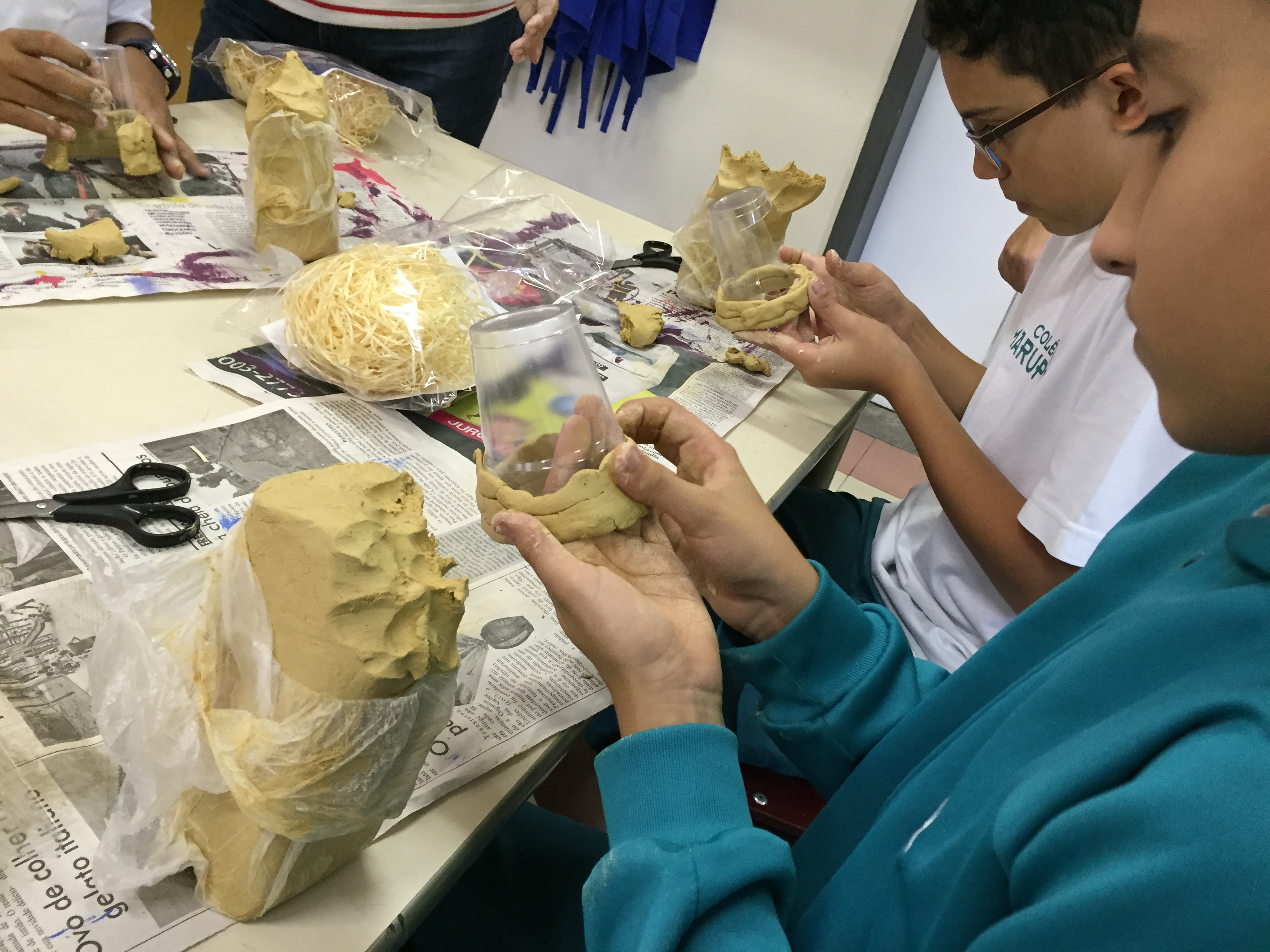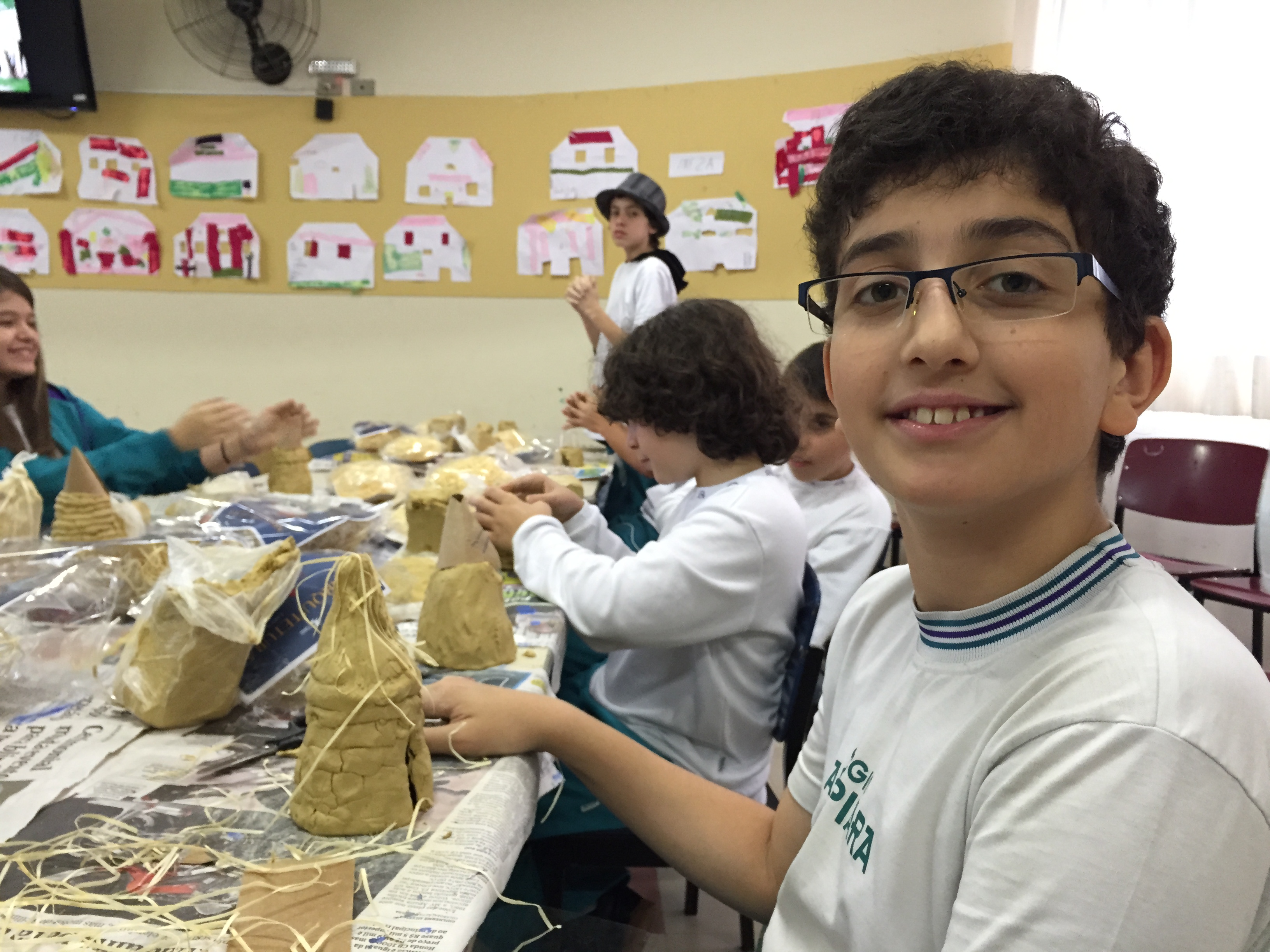 Antes da oficina, conversei com as crianças sobre o tipo de construção africana específica de Togo: qual o tipo de material usado, como são os moradores da casa e como a moradia reflete o estilo de vida e os elementos da cultura própria daquele povo; e também comparamos as moradias de Togo com construções similares que vemos aqui no Brasil, como as casas de sapé e as ocas indígenas. Depois colocamos a mão na massa – literalmente! E ensinei às crianças como construir uma miniatura desse tipo de moradia usando os kits prepardos pela Karin. As crianças adoraram e as casinhas ficaram muito legais.
