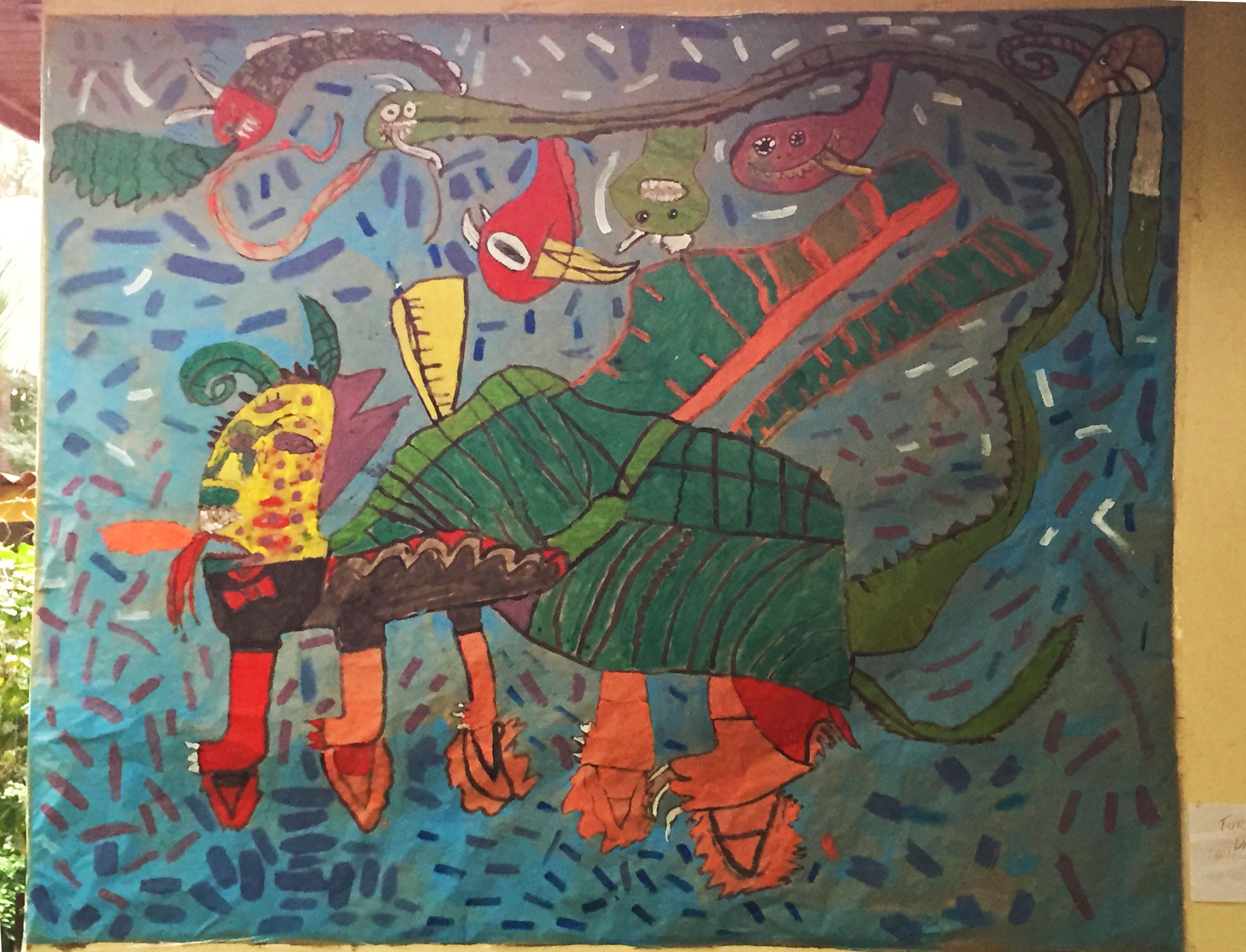Andando pela escola, ouvi sons de crianças brincando, de vários instrumentos, de cantos… vi trabalhos artísticos geniais feitos pelas crianças e espalhados pela escola, aqui estão alguns exemplos: